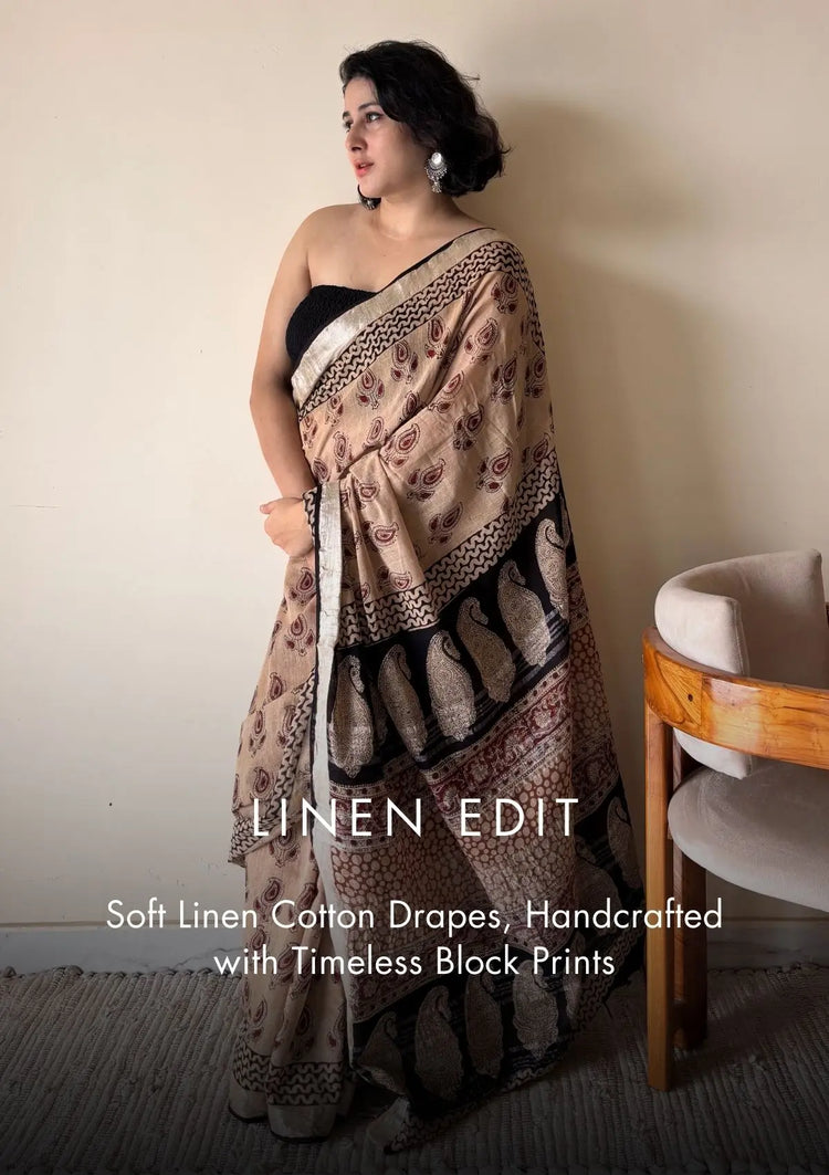 Soft, graceful, and radiant, Kasturi – Linen Cotton Bagru Handblock Saree brings the warmth of peach blossoms to every drape. Handcrafted in a delicate linen-cotton blend, its subtle peach base...