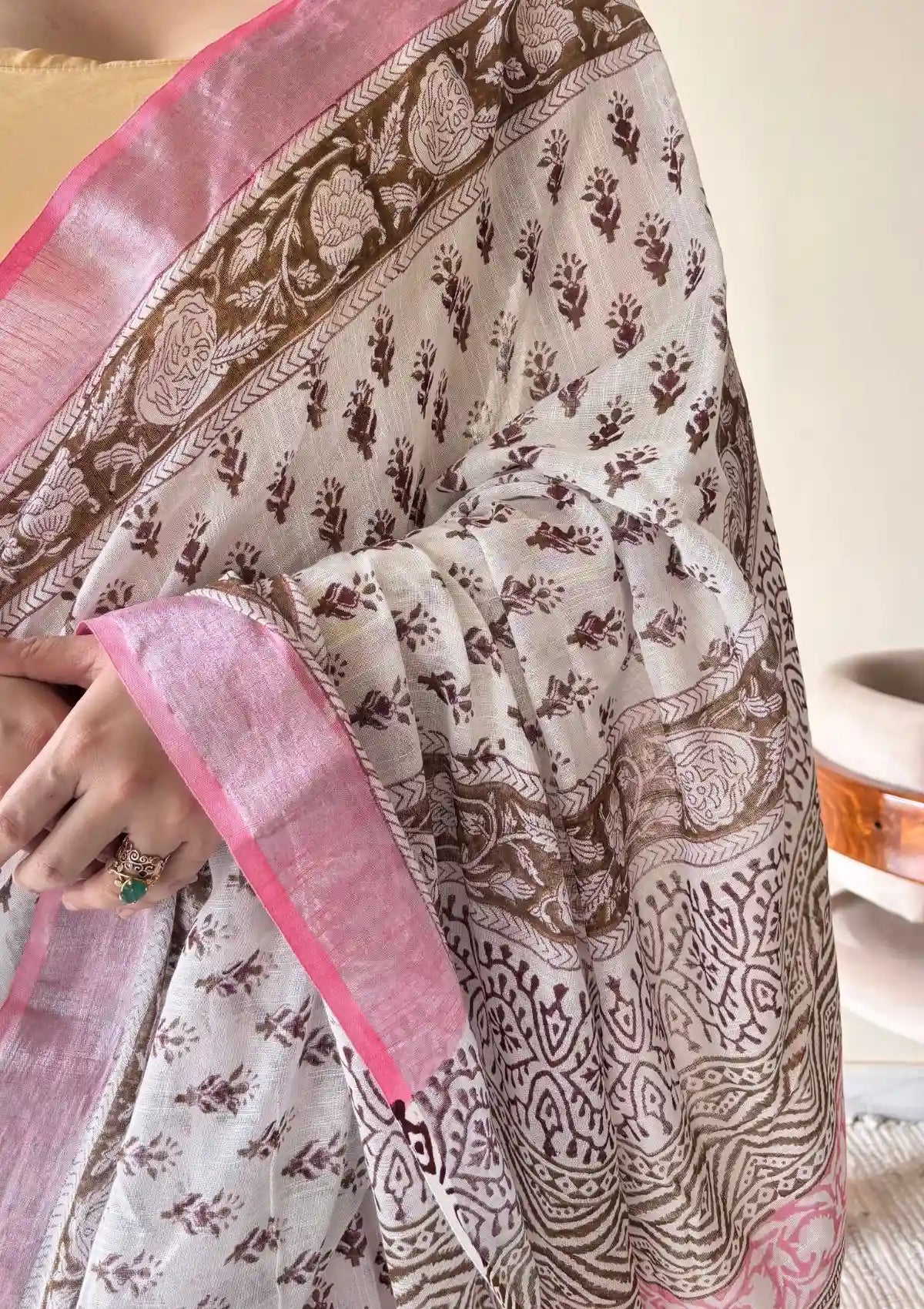 Delicate and graceful, Bela – Linen Cotton Bagru Handblock Saree captures the essence of timeless femininity. Crafted in a soft linen-cotton blend, its pure white base adorned with subtle pink Bagru motifs reflects freshness, purity, and charm. Light, airy, and artisan-made, this saree is perfect for summer celebrations, serene evenings, and everyday elegance.