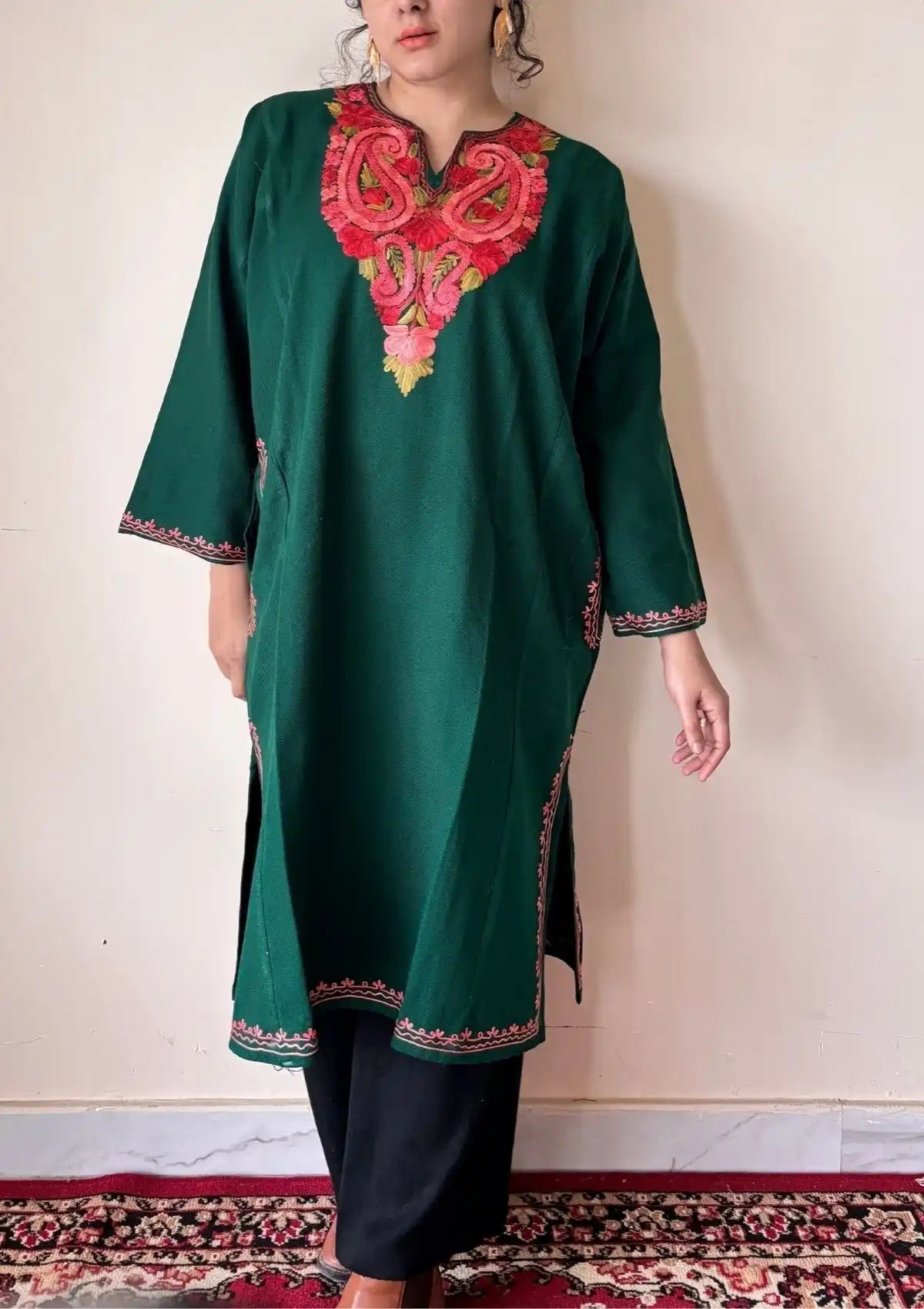 Rooted in tradition and crafted for winter living, the Dilnaz phiran is made from warm Cashmilon wool for lasting comfort. This forest green Kashmiri phiran features bold traditional aari embroidery at the neckline, echoing motifs shaped by generations of craftsmanship. Soft, insulating, and fluid in drape, it offers warmth without weight. Designed for everyday winter wear, work, and travel, Dilnaz reflects timeless heritage with effortless modern ease.