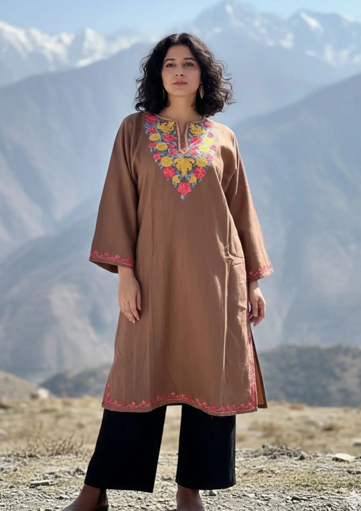 Soft, earthy, and timeless, the Fareeha phiran is crafted in warm Cashmilon wool to offer comfort through cold winter days. This beige-brown Kashmiri phiran features delicate handcrafted floral aari embroidery along the neckline, inspired by Kashmir’s traditional design language. The relaxed silhouette allows effortless layering while maintaining a refined drape. Gentle on the skin and insulating without heaviness, Fareeha is an everyday winter essential—perfect for work, travel, and understated ethnic styling rooted in heritage.