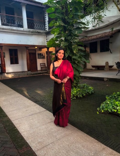 For effortless chic and breathable comfort, Tarini is your go-to maroon mulmul cotton saree. Featuring bold black color blocking and a golden tissue border, it brings together modern flair and traditional elegance. Designed to stand out during weddings, parties, and festive occasions.