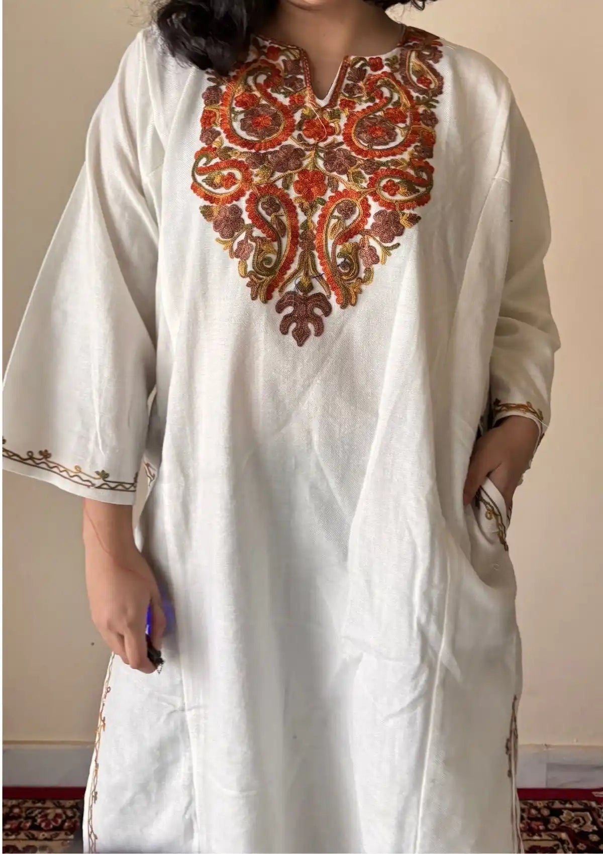 Pure and understated, the Naira phiran is crafted in warm Cashmilon wool for serene winter comfort. This white Kashmiri phiran is accented with delicate floral aari embroidery, drawing inspiration from Kashmir’s natural landscapes. Light on the skin yet insulating, it offers a relaxed silhouette perfect for layering. Ideal for daytime winter wear and quiet gatherings, Naira reflects elegance, simplicity, and the timeless beauty of traditional Kashmiri artistry.