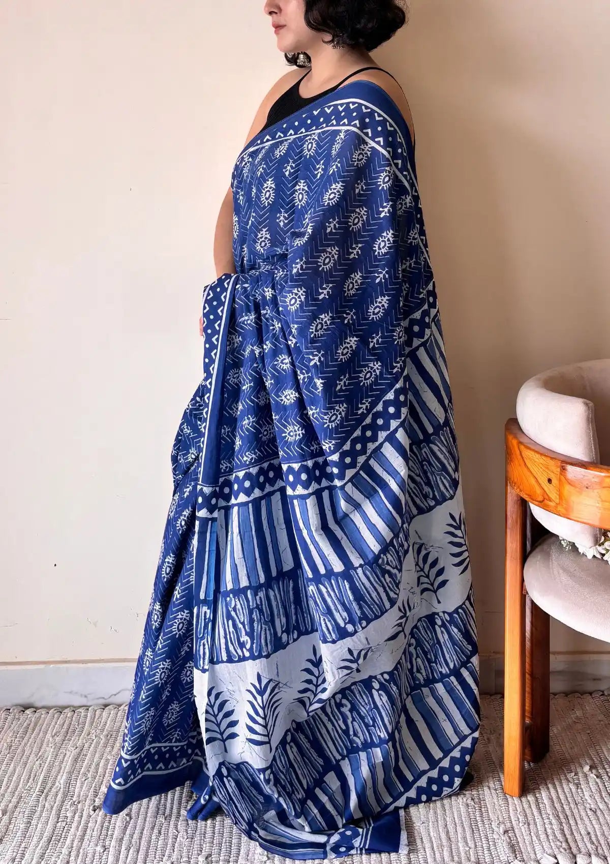 Product Type: Saree Length: 5.5m (550 cm); Width: 1.15m (115 cm) Blouse Piece: Yes Fabric: Pure Cotton Colour: Indigo Blue Craft: Bagru Handblock Wash Care: Gentle Hand Wash or Dry Clean Disclaimer: This saree is handcrafted, so slight irregularities in craft and colour are natural and enhance its beauty. Colour may vary slightly due to screen brightness. Please Note: This saree comes with fall and edging. SKU: SR0033 What You Will Receive: 1 Finished Saree (Fall and Edging Included) with Blouse Piece